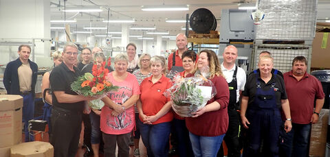 Im Kreise der Belegschaft in unserer Produktion gab es zunächst ein leckeres gemeinsames Frühstück. Dabei gab es alte Erinnerungen an all die vielen Jahre der Tätigkeit in unserem Unternehmen und gemütliche Gespräche.