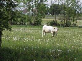 Gleich hinter unserem neuen Produktionsgebäude weiden die Kühe auf unserer Wiese. Welch ein idyllischer Anblick. Man hat hier den Eindruck, daß sich Mensch und Natur im Einklang befinden.,... und in der Wiese neben den Kühen geht der Storch auf Beutefang!