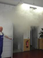 Mittels einer Nebelmaschine wurden im Technikraum des Lastaufzugs die Rauchmelder aktiviert. Natürlich war diese Übung keinesfalls angekündigt, jedoch erschien die Reaktion der Kollegen doch recht gelassen, teils wie abgesprochen… Wer die Situation vorher genau beobachte konnte wahrscheinlich 1+1 zusammenzählen… Alle verließen kurzerhand ihren Arbeitsplatz und fanden sich vorbildlich auf dem Sammelplatz hinter dem Gutshaus ein. Ob jedermann jedoch auch so in einem „wahren“ Brandfall reagieren würde, bleibt offen. Jeder sollte sich hier noch einmal Gedanken machen.