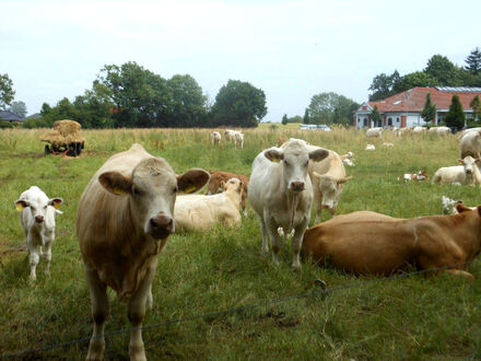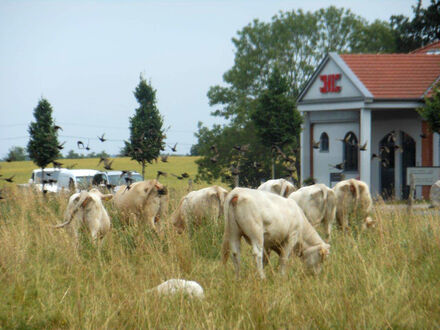 Direkt auf unserem Firmengelände weidet derzeit wieder eine Rinderherde mit ihren Jungtieren und erfreut uns mit ihrer Anwesenheit. Die Tiere lassen sich beim Futtern nicht stören und weder von unserer Arbeit noch vom Fußballgeschehen ablenken.