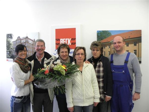 Die Jubilarin im Kreise der Kollegen/-innen. V.l.n.r.: Christiane Beck , Dr. Dieter (GF) Beck, Ela Plötz, Bianca Marquardt, Petra Wallmuth und Holger Franz (Fertigungsleiter).