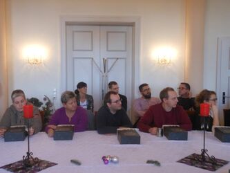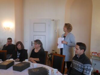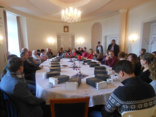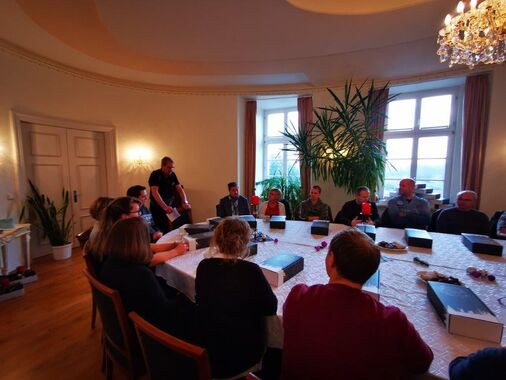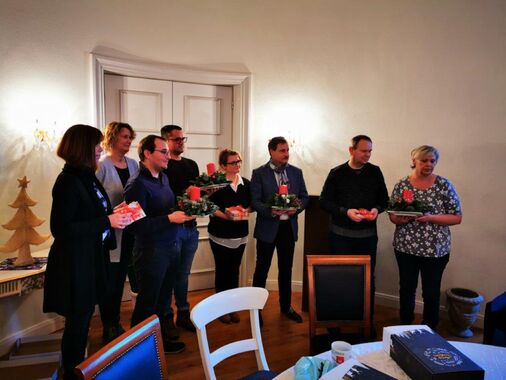 Um die Mittagszeit versammelten wir uns im "Eiersaal" des Gutshauses und stimmten uns bei Glühwein und weihnachtlichen Klängen auf die Feier ein. Die Geschäftsfürer Dr. Dieter Beck und Nikolas Loebenberger ließen in jeweils kurzen Ansprachen an die Belegschaft das Jahr 2019 Revue passieren und gaben Ausblicke auf die Ziele und Vorhaben für das neue Jahr 2020. Beide Chefs sprachen den Kollegen und Kolleginnen ihren Dank für den tatkräftigen Einsatz im ablaufenden Geschäftsjahr aus.
