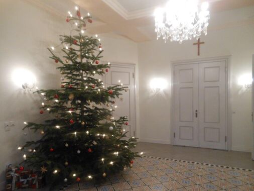 Vor dem Haus leuchtet unser Weihnachtsstern und im Foyer steht wieder unser Christbaum.