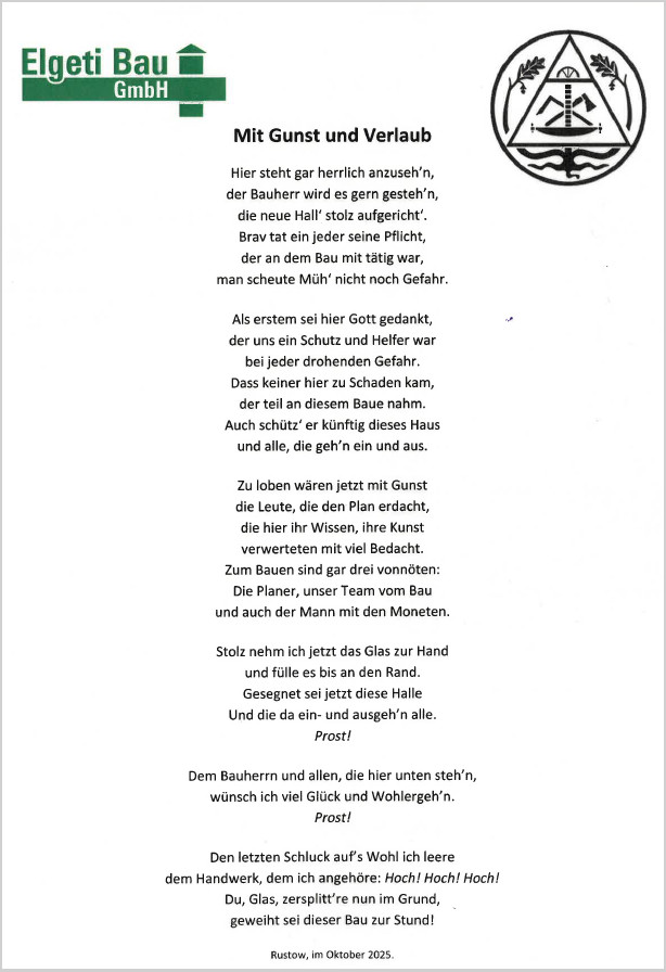 Gemeinsam mit dem Generalbauunternehmer Elgeti GmbH – und den Maurern, Zimmerleuten und Dachdeckern – feierten wir das Richtfest. Die Ansprache hielt GF Konstantin Beck und nahm den Richtspruch in der Höhe entgegen. Anschließend waren unsere "Betriebsgrillmeister" im Einsatz und wir ließen uns gemeinsam in der Produktionshalle mit leckeren Speisen und Getränken verwöhnen.